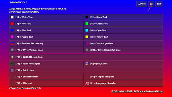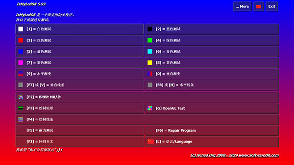 IsMyLcdOK是一个非常小巧免安装的液晶萤幕(LCD) 坏点检测小程序,它利用各种不同的颜色来填满整个萤幕,让我们得以轻易地观察萤幕是否有暗点、亮点等坏点。这款免费软体启动后会出现测试说明画面,按下从 1 到 0 的每个数字键会让萤幕显示不同的颜色,其中的 9 和 0 会显示渐变色。另外,按下 F2、F3、F4、F5、F7 或 F8 则会显示比较复杂的测试画面。