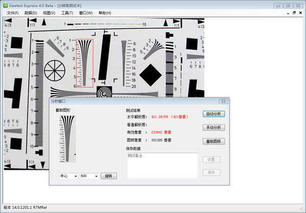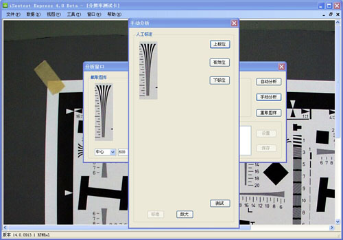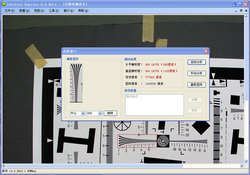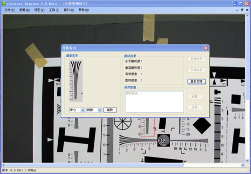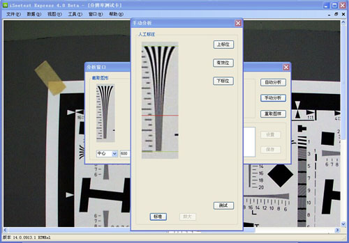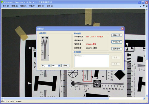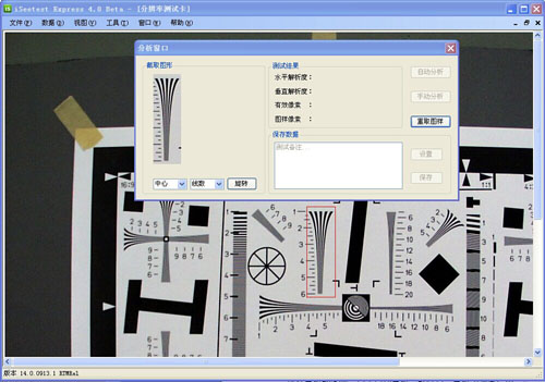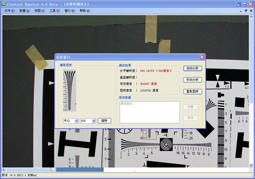 五、点击重新取样,重新选择楔形线;选择分析的线数,旋转图形,点击自动分析,面就是一个完整的摄像头水平解析度、垂直解析度和有效分辨率(有效像素)的测试结果。