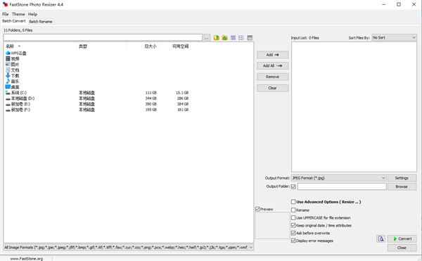 FastStone Photo Resizer是一款免费、轻量且功能强大的图片批量处理软件,主要用于快速、方便地对大量图片进行格式转换、尺寸调整、重命名和基础编辑,可以批量的加水印, 能够让用户对大量的图档进行转换,例如使用者拍的照片是BMP格式,通过一个按键就将它们一次转成JPEG格式,方便储存。