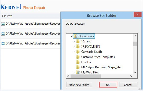 执行修复之前的有效解决方案要求用户提供要修复文件的保存路径,Kernel Photo Repair通过简单的浏览操作,可以自定义文件的保存