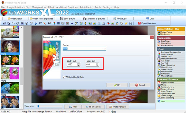 您可以以像素,厘米或毫米为单位更改实际尺寸。选择所需的尺寸。正在显示图片的当前高度和宽度。每当您更改height或width的值时,纵横比都将保留。默认情况下,第二个值将被重新调整以防止变形(必须选中“宽高比”复选框。取消选中该复选框将使用您自己的宽高比)。