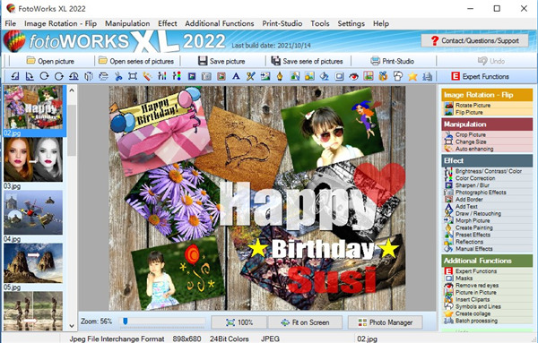 此外,照片编辑器还包含许多有趣的照片编辑效果,使您的照片更加有趣并焕发出全新的光彩。此外,还有许多其他功能,例如集成的打印工作室,以及用于创建单独的照片日历,相册,照片卡和大海报以将其照片展示在墙上的功能。当然,您可以准备或打印所有标准尺寸的照片打印件。