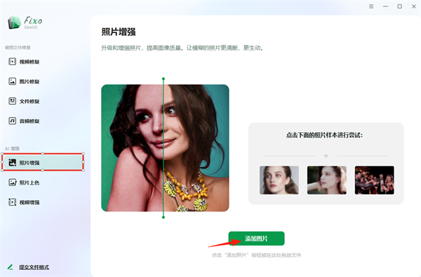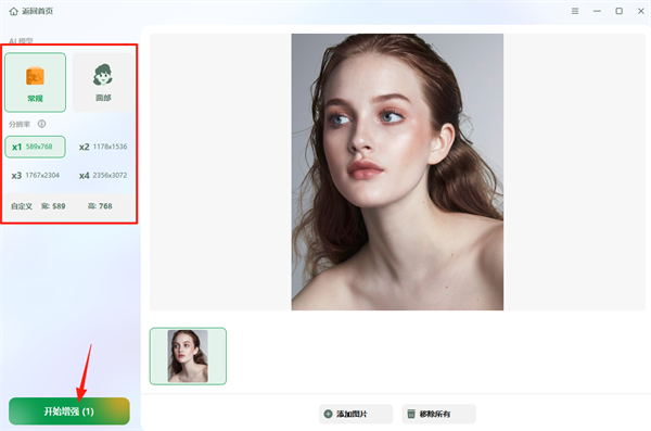 1、点击左边红框处,“图片增强”,随后点击添加图片。