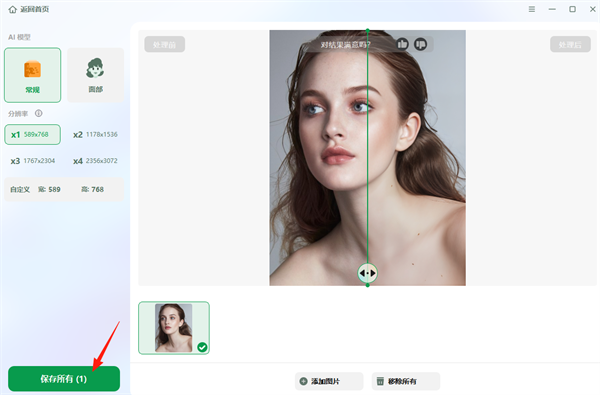 3、完成后,可以看到图片中间的竖线,拉动,可以看见增强前后的效果,随后就可以点击左下角保存了。