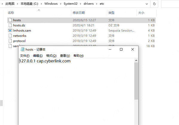 2、首先修改电脑的hosts文件,加入127.0.0.1 cap.cyberlink.com,这个是屏蔽注册联机功能;hosts文件位置:C:\Windows\System32\drivers\etc