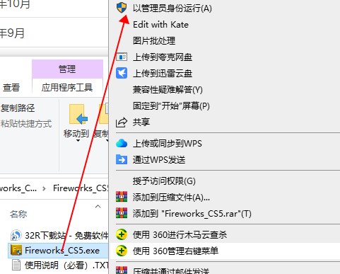 2、选中Fireworks_CS5,鼠标右键选择 “以管理员身份运行”;