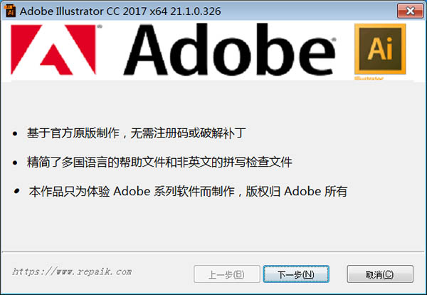 1.下载好数据包后,直接解压用鼠标双击“Illustrator+CC+2017+22.0.0.243.x64.exe”打开进入安装向导,点击“下一步”
