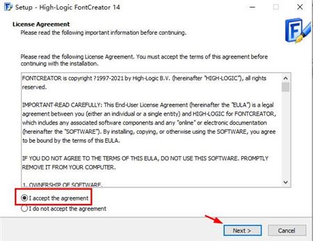 2、双击“FontCreatorSetup-x64.exe”文件运行,勾选同意协议
