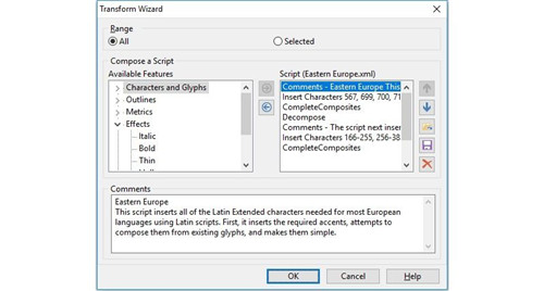 标准版和专业版带有强大的转换向导,只需单击几下即可轻松转换字形。自动将您的字体转换为斜体或粗体。添加其他语言、小写字母等的字符。