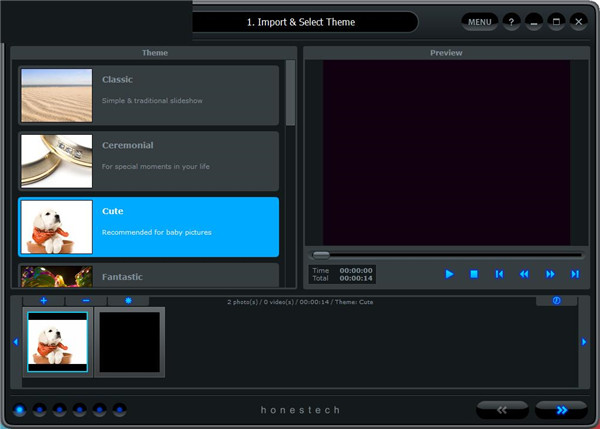 honestech PhotoDVD自动添加的介绍性幻灯片,其中包括文本标题,标题幻灯片将根据所选主题而变化,结束幻灯片–程序自动添加的包含日期戳的结束幻灯片,结束幻灯片将根据所选主题而变化