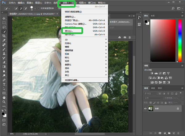 2、选择【滤镜】,点击【液化】。