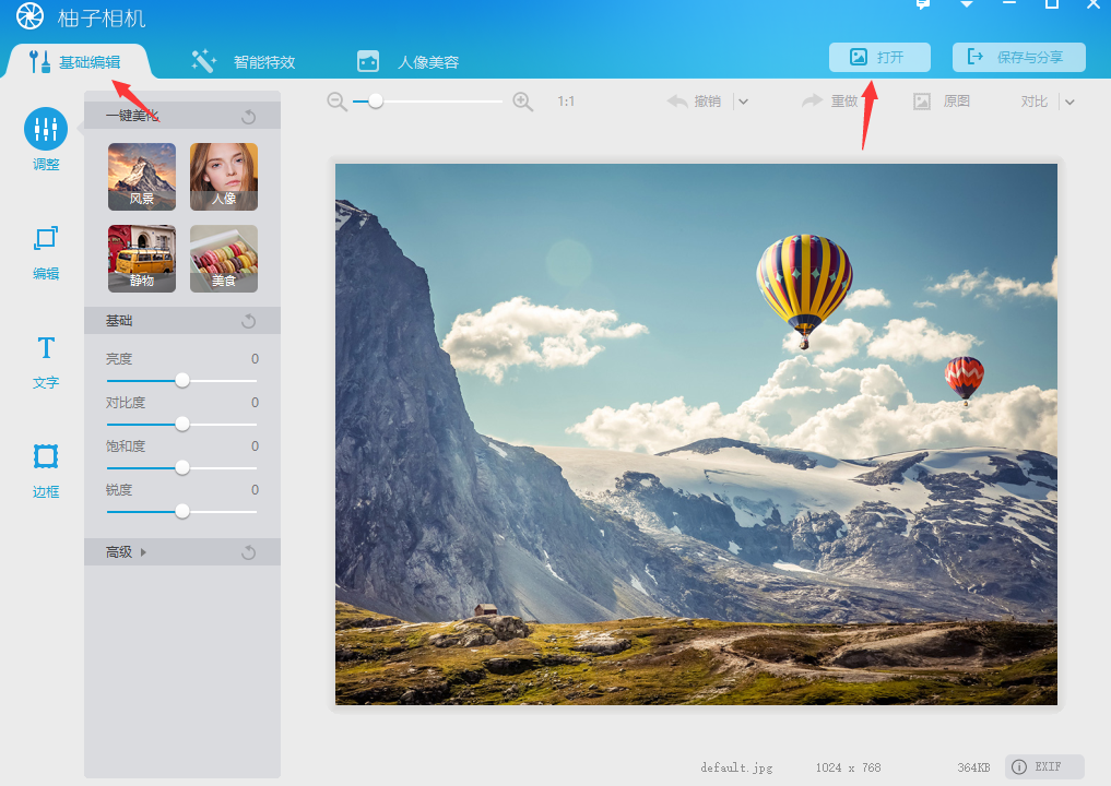 1、打开柚子相机,然后点击基础编辑中的“打开”