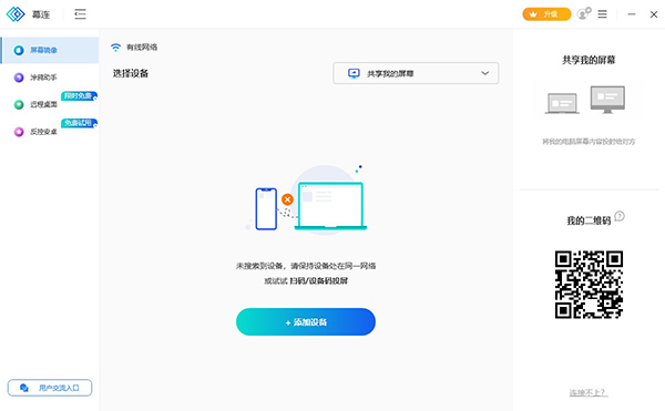 幕连投屏电脑版是一款专业屏幕投屏软件,软件界面简介,用户仅需几步操作就能实现多平台设备之间相互投屏连接,适用于教学、会议、观影等多种情况,让投屏像呼吸一样简单、流畅。