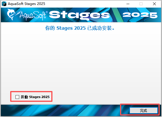 9、安装AquaSoft Stages 2025成功,取消勾选开始 AquaSoft stages 2025,然后点击完成;
