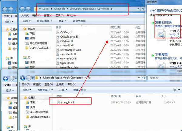 4、将trreg_bl.dll复制到安装目录中,点击替换目标中的文件,默认路径CF:\Users\用户名\AppData\Local\Ukeysoft\Ukeysoft Apple Music Converter。