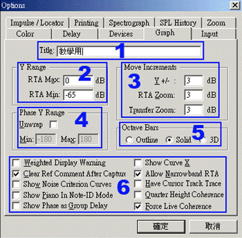 1. Title ( 头衔 )自个填上或不要。2. Y Range ( 垂直轴的范围调整 )。RTA Max ( 实时分析,最大标记值 )。RTA Min ( 实时分析,最小标记值 )。这里就是调整最高与最低的标记值,参照什幺呢?来我告诉你,如果你是把 SIA 5 用来读取电路的讯号电平,例如你是把一台混音器的输出接进来分析时,那你可以观察混音平台的电平标记,数字混音平台是最快调整的,例如 O2R - 96 最大值肯定是 0 dBFS,最小指示值是 - 65 dB 就把它填进去,如此一来,这 ( ASIO 声卡 ), 3. Move Increments ( 移动调整的增值 ),就是当你以 Page UP / Down key 来快速调整时,每次更动的加减数值设定。4. Phase Y Range ( 垂直轴的相位范围 ),这个功能是提供给 Transfer 的相位量测时用的,平常是如图灰色的 -180 / 180,当你将 Unwrap ( 展开 ) 打勾,它将成为 - 360 / 360 度的全开相位指示。5. Octave Bars ( 音程条栏 ),它是在图形显示时的表示图形。( 轮廓 ),只显示线条轮廓而不上色。Solid ( 实心 ),整条是有颜色的显示。3D 立体的音程条表示,跟本不好看!!以上,主要的重点都有了,第 6 项框内有一些打勾框,是等响曲线的显示,钢琴频键的记号显示,这些的附加功能看你须要否,随人,每个都写,我会写不完,挑重要的就好啦。