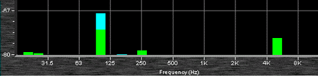 这个区块的设定是当你在 Spectrum 的 RTA 模式下,再开启 Spectro 的显示功能,画面如右上图标, Max ( 最大值 ),一个是填上最高电平值,另一个是最高电平时所显示的颜色选择。Min ( 最小值 ),一个是填上最低电平值,另一个是最低电平时所显示的颜色选择。Number ( 数量 ),颜色数量的选择从 8 ~ 236 的数目,积数愈高,显示的图色愈精细,相对的你的计算机级数要高。Gray ( 灰阶 ),图形显示采用灰色系。Default ( 预设 ),恢复SIA 5 的颜色默认值。