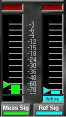 Input Meter ( 输入表头指示 ),从声卡进来时的 A / D 电平大,这两信道的指示是采用 dBFS 的标记,表头下方有一个 Active ( 作用 ),当两信道都有讯号输入时,使用这个按键来决定显示的资料读出。下方左右的两个按键决定输入的讯号的图表信息是否显现或是隐藏,按键上的字眼说明就是当它们应用在ransfer or Impulse 的模式时,左信道是输入欲要量测的讯号源,所以标示Meas Sig ,右信道是直接输入讯号源,所以标示 Ref Sig。