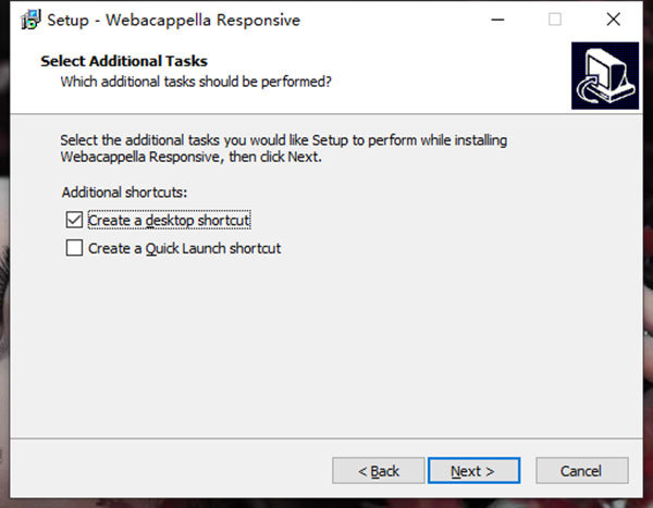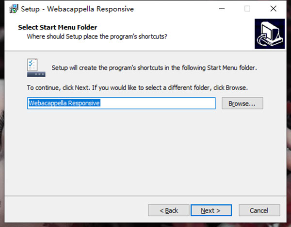 5、提示开始菜单名字设置为WebAcappella Responsive,点击next。