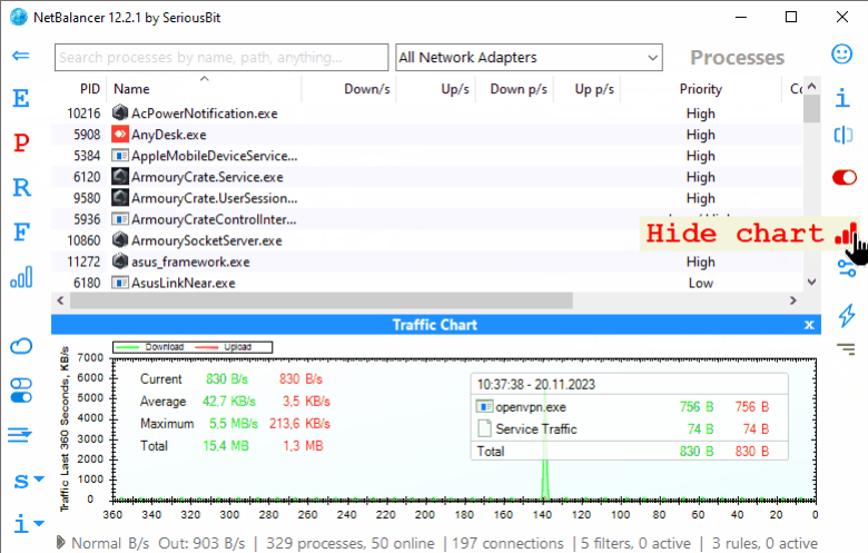 自首次安装NetBalancer以来,任何进程的详细下载和上载流量历史记录。