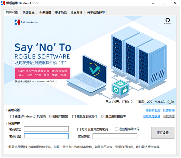 3、佰盾铠甲的密码保护功能初衷是让业余使用者不会因误操作退出程序,所以密码故意设置得很容易清除。