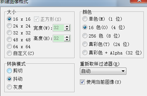 7.以生成16色的分辨率为16*16的图标为例,大小选择为16*16,颜色选择为16色,转换模式选择为“抖动”,勾选“使用当前图像”,点击“确定”