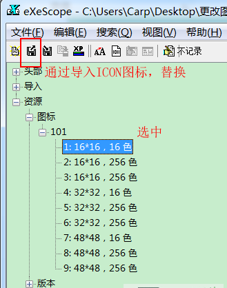 10.之后进行图标替换,选中“16*16,16色”选项,点击工具栏中“导入“按钮(工具栏左边第2个),选中合适的图标,即可完成该图标的替换,之后进行保存。