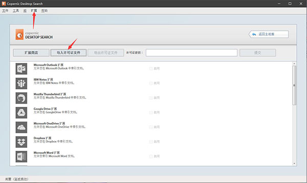 3、成功安装软件后,打开软件选择菜单中的扩展,在扩展选项卡中,请单击底部的导入许可证文件,然后选择附件的许可证文件;