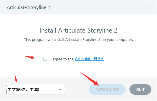 2、勾选“I accept to the Articulate EULA”,然后选择“Chinese”,再点击“install now”