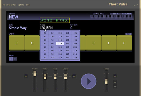 1、享受练习乐趣的同时,以乐器演奏家或歌手的身份提高自己。选择一个简单的和弦进行,单击一种音乐风格,然后开始播放。ChordPulse激励任何人练习更多。