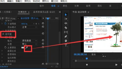 4、在超级键效果中,选择吸管工具吸取需要抠图的底色,就可以去除底色进行抠图。如果底色复杂的,可以利用钢笔工具进行抠图。