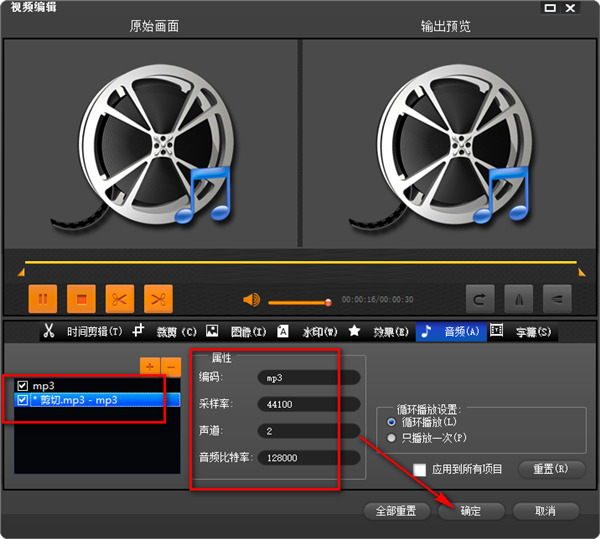 6、点击这个打开按钮将音频添加到音轨列表之后,我们可以选中它,然后对它的属性进行自定义设置,设置完成点击确定按钮即可。