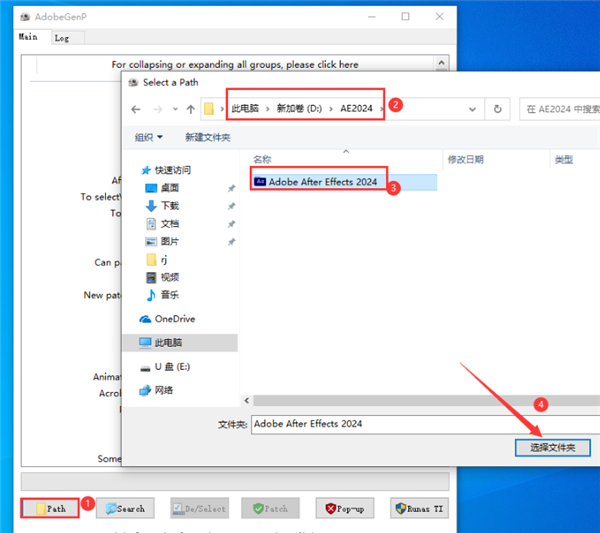2、等待片刻,安装完成,打开Adobe-GenP-3.4.14.1-CGP文件中的第一个文件夹以管理员的身份运行(需提前关闭杀毒软件),选择Path选择安装AE2024程序;