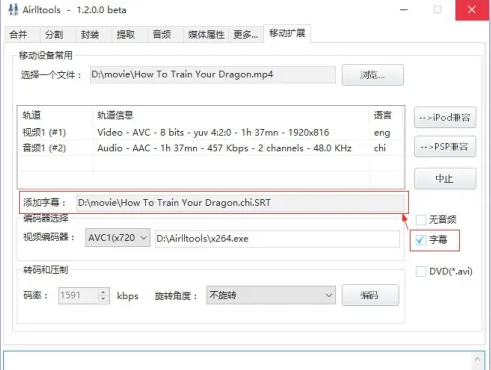 勾选“字幕”选框,此时将会出现新的输入框。拖动字幕到,字幕文件输入框中,如图所示。
