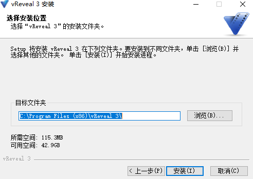 6、选择vReveal的安装目录,默认路径为C:\Program Files (x86)\vReveal 3,可默认,若需安装到不同文件夹,单击“浏览”可选择其他文件夹进行安装