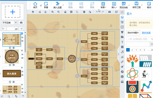 点击 “背景”按钮,在“图片背景”选项中可直接点击预设图片背景(简约、风景、人物、线条、其他)作为导图背景,也可以点击“选择文件”按钮在新窗口中添加本地图片背景。