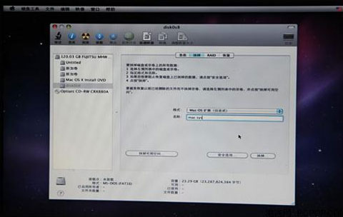 5、在这里并没有列出专门为Mac OS X准备的分区,因为那个容量为23GB的分区没有格式化,所以在这里一定要注意。不要点击继续,执行下面的操作。