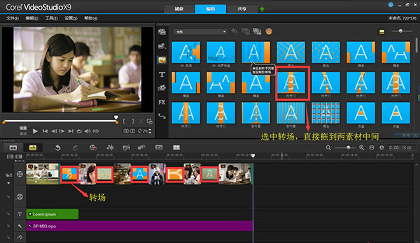 2)、选中其中一个转场,按住鼠标左键不松手;