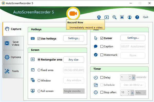 1、记录矩形区域,窗口,全屏,活动窗口或对象。2、包括带有增加效果的鼠标指针的可见性。