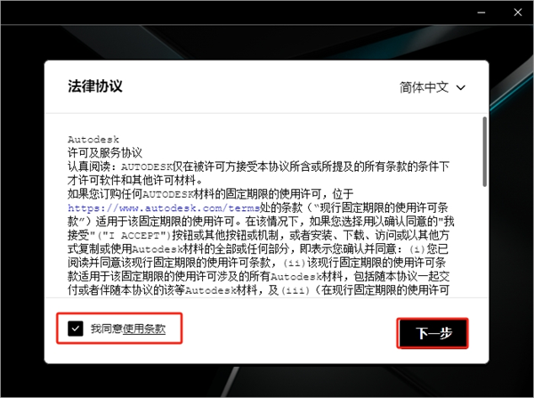 3、勾选我同意使用条款,然后下一步。