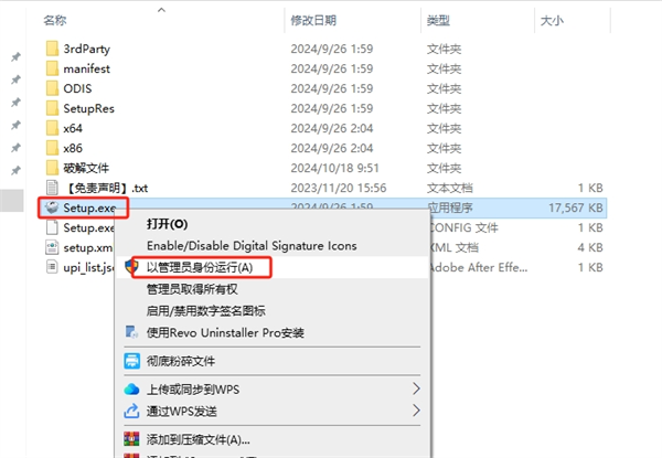 1、软件安装包下载到电脑本地,使用解压工具进行解压打开,鼠标右键以管理员身份运行(Setup.exe)。