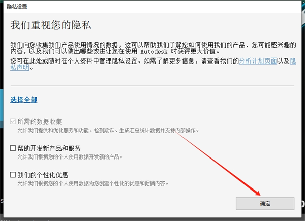 11、软件隐私设置,直接点击确定即可。