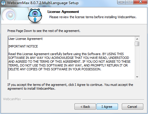 1、下载WebamMax压缩包文件,并解压到当前文件夹中,点击其中的WebcamMax-8.0.7.2.MultiLanguage.Setup.exe应用程序,进入许可协议界面,选择我接受,点击下一步。