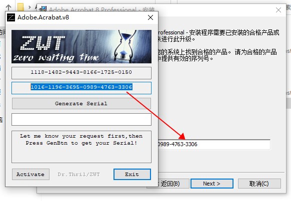 4、将上面的序列号填如Acrobat 8的安装向导中