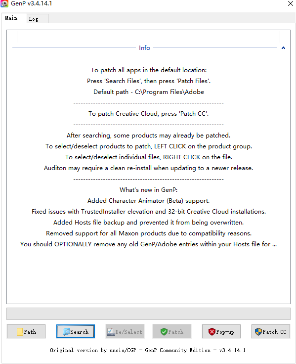 3、,然后点击Search,会自动查找安装目录里面安装的所有Adobe软件,查找完成之后,勾选你需要修改的软件,完成后点击Patch即可。