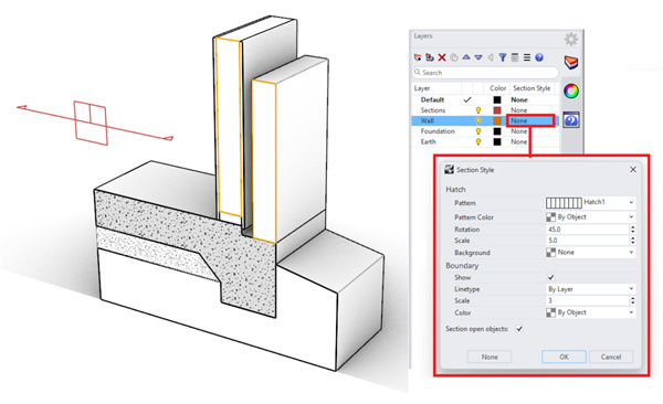 找到 Wall 图层,然后在剖面样式属性下,点击无。剖面样式对话框打开,您可以为图层设置自定义样式。在对话框中,将剖面线图案设置为 Hatch1,将旋转设置为 45 度,将缩放设置为 5,将背景设置为 无,然后单击确定/应用。