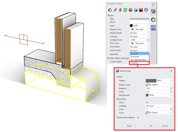 想要探索其它物件的剖面样式,请选择位于 Foundation 图层中的物件,打开物件属性面板,在剖面样式属性下点击自定义。要更新剖面的位置,请选择位于 Sections 图层中的截平面,然后拖动或旋转截平面就可改变剖面位置。