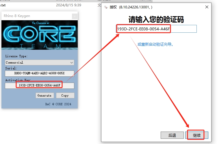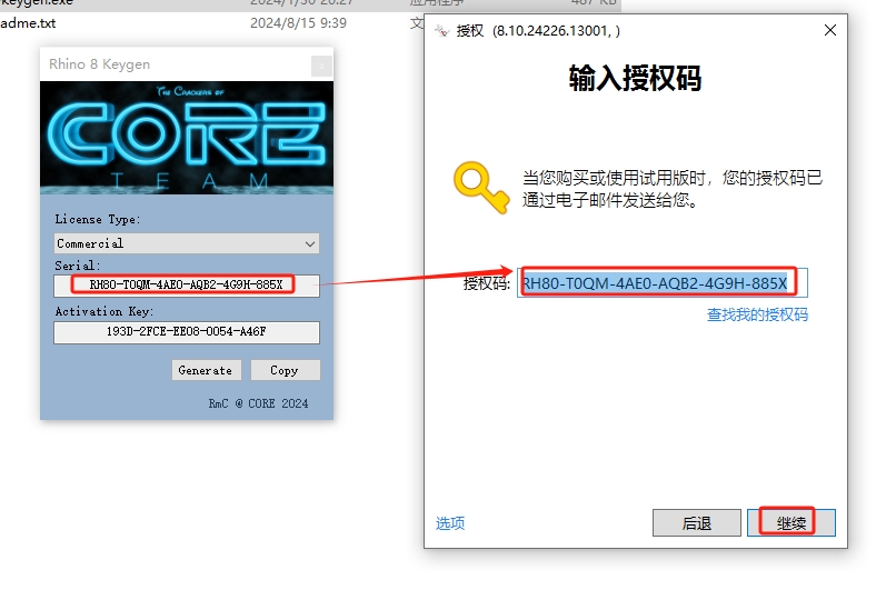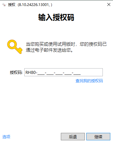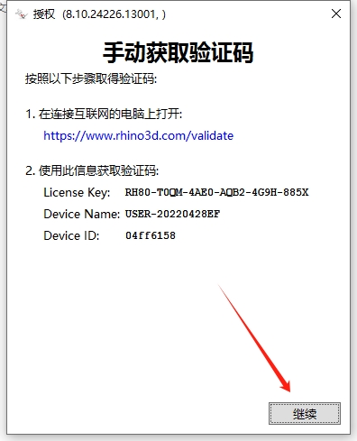 14、将注册机生成的授权码复制到软件界面对应框中,然后点击继续。