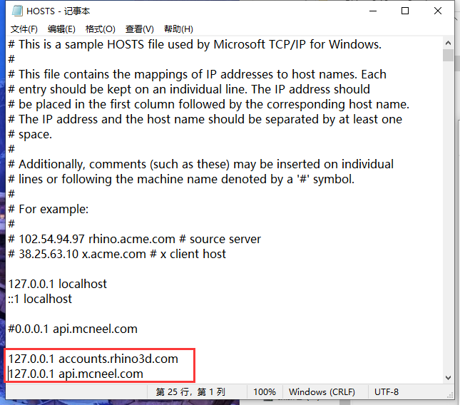 7、在hosts文件内输入内容:127.0.0.1 accounts.rhino3d.com 127.0.0.1 api.mcneel.com 然后保存hosts文件。