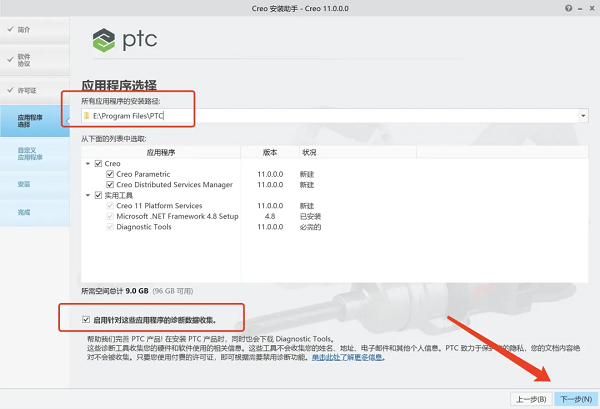 13、修改安装位置路径中的首字符C可更改安装位置,本例安装到D盘,取消勾选【...诊断数据收集】,然后点击下一步。